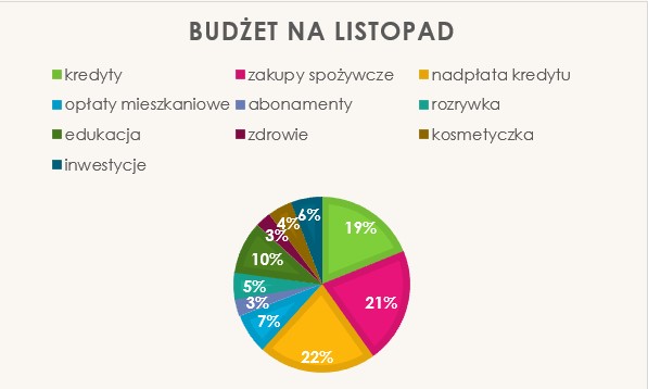 Mamy obecnie dwa kredyty – i zgodnie z zasadą „najpierw mniejszy, bardziej oprocentowany” – skupiamy się na tym mniejszym zobowiązaniu z wyższym oprocentowaniem, by jak najprędzej je zamknąć. Październik był miesiącem, w którym konsekwentnie to kontynuowałam.